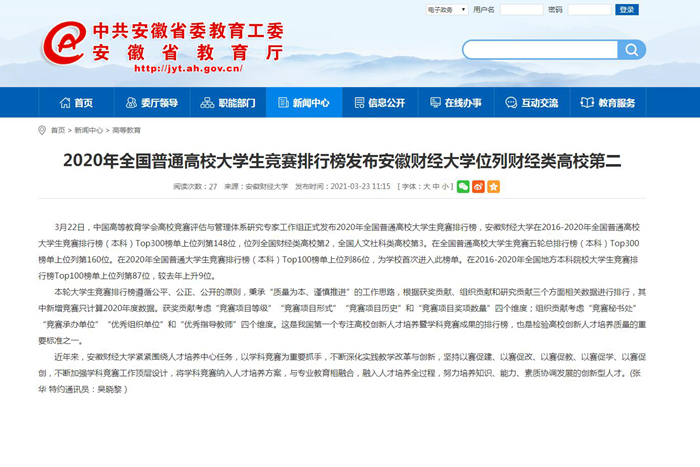 3月23日,安徽教育网以“2020年全国普通高校大学生竞赛排行榜发布 乐竞在线注册位列财经类高校第二”为题报道我校学科竞赛排行情况。