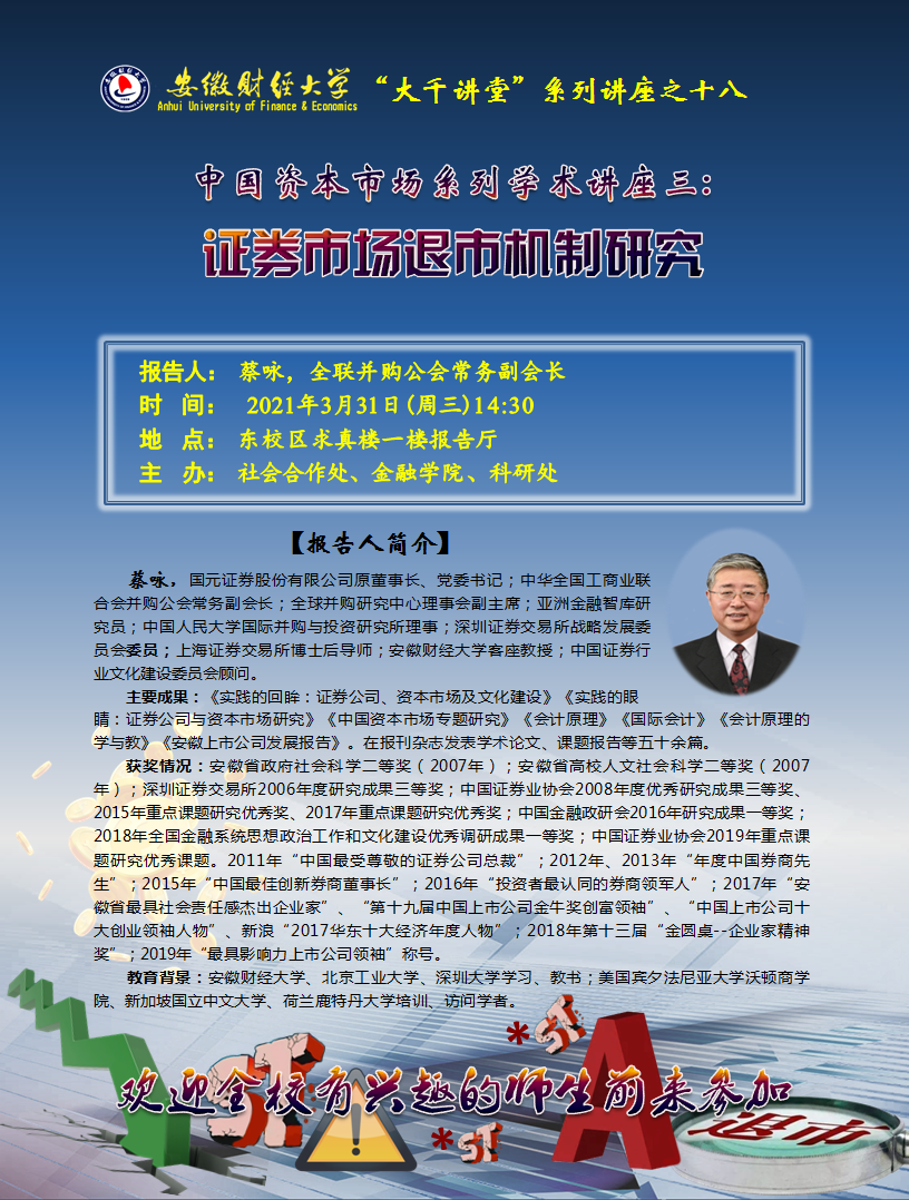 2021年3月31日:【“大千讲堂”系列讲座之十八】中国资本市场系列学术讲座三: 证券市场退市机制研究