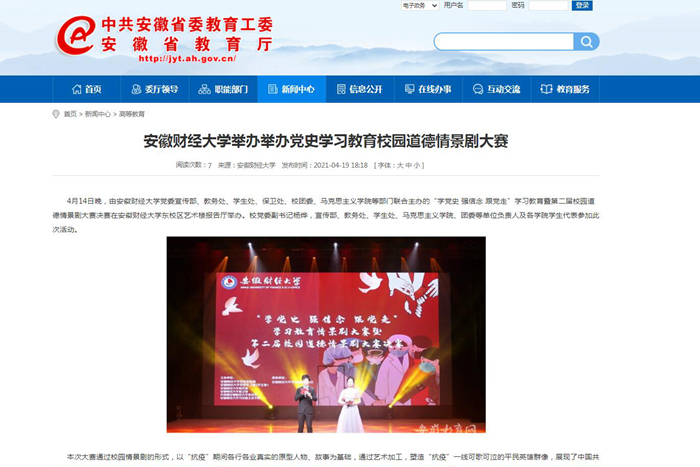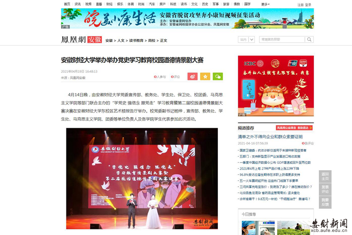 4月19日,凤凰网、安徽新闻网报道我校举办党史学习教育校园道德情景剧大赛。