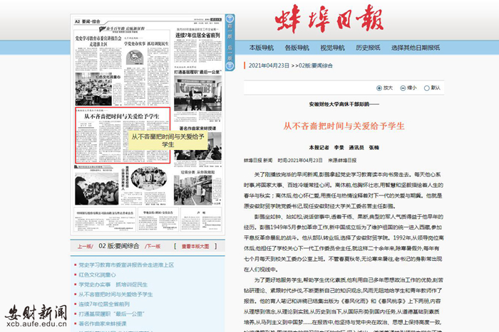 《蚌埠日报》蚌埠文明网以《从不吝啬把时间与关爱给予学生》为题刊文报道我校关工委名誉主任彭鹏。