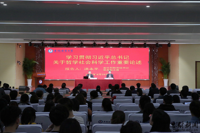 429日下午,安徽省社科联党组书记、常务副主席洪永平教授在求真楼一楼报告厅作了题为“加快构建中国特色哲学社会科学——学习贯彻习近平总书记关于哲学社会科学工作重要论述”的专题报告。报告会由校党委常委、副校长冯德连主持,校党委常委、副校长周加来、程刚,副校长张焕明出席。全体中层管理干部、专职辅导员、马克思主义学院教师及学生代表300余人参加报告会。