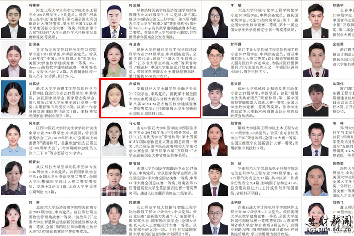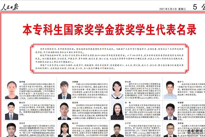 5月4日,《人民日报》用四个整版刊登了100名本专科生国家奖学金获奖学生优秀代表和100名中等职业教育国家奖学金获奖学生优秀代表名录。其中,我校金融学院金融学专业2017级学生卢敏欣成为我省唯一“上榜”的大学生。