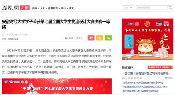 4月22日至25日,凤凰网、安徽新闻网以《乐竞在线注册学子荣获第七届全国大学生物流设计大赛决赛一等奖》为题,报道了我校学子荣获第七届全国生物流设计大赛决赛一等奖。