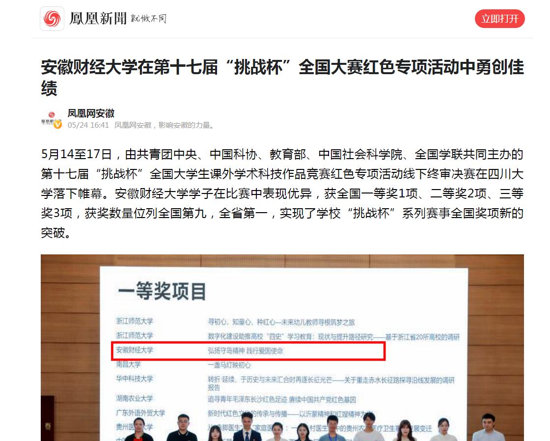 5月24日,安徽教育网、凤凰网、安徽新闻网报道我校在第十七届“挑战杯”全国大赛红色专项活动中勇创佳绩。