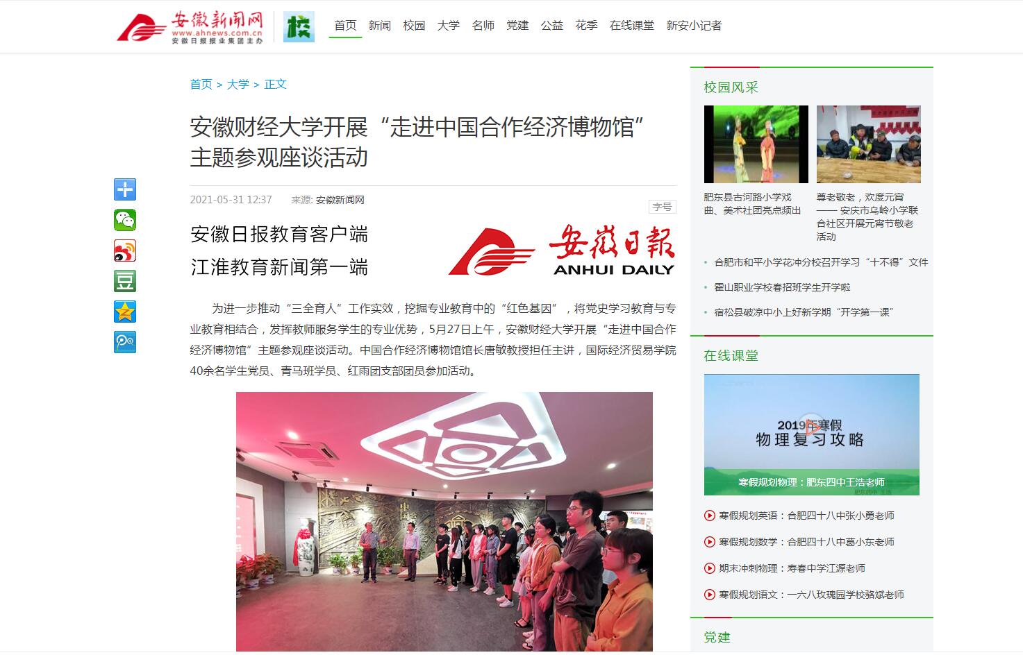 5月31日,安徽教育网、凤凰网、安徽新闻网以《乐竞在线注册开展“走进中国合作经济博物馆”主题参观座谈活动》为题报道我校充分利用博物馆资源开展特色党史学习教育。