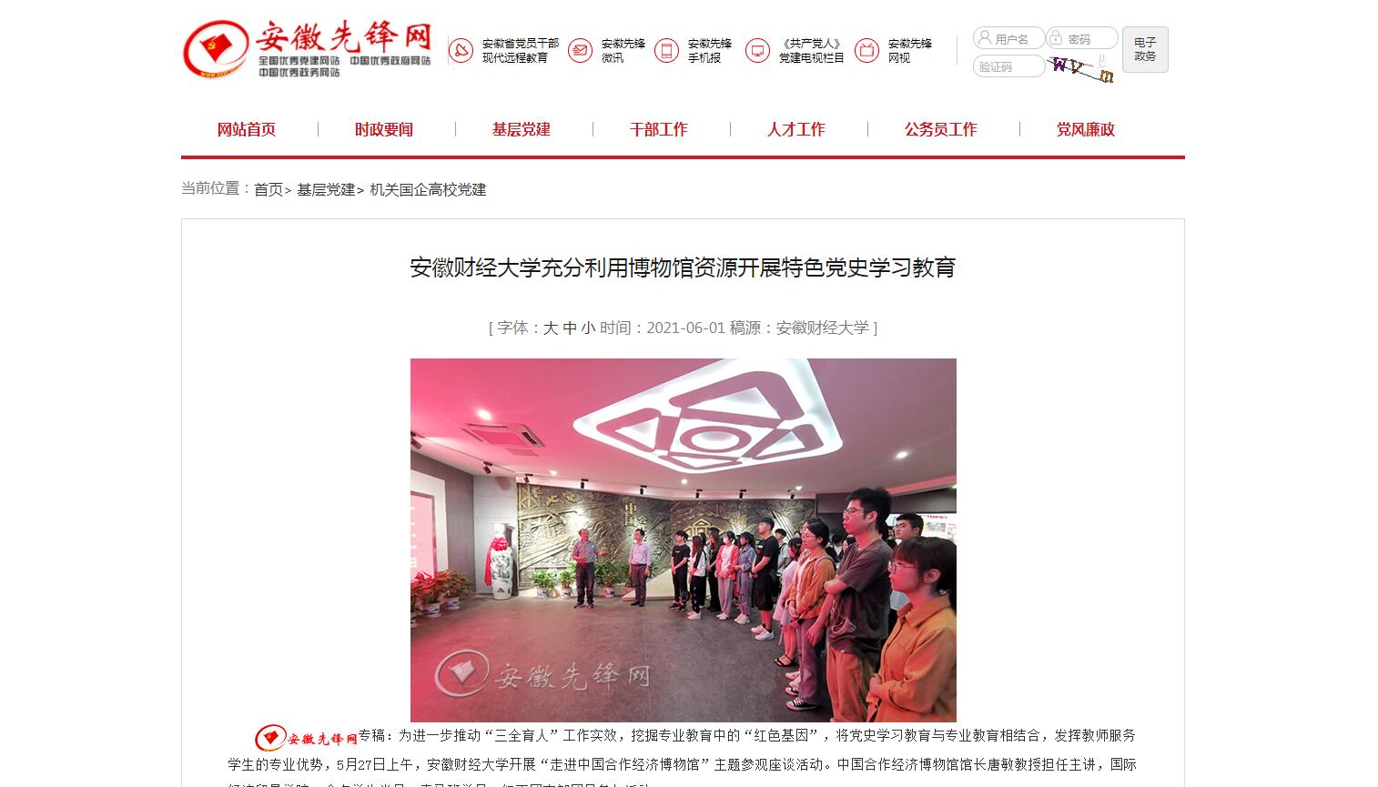 安徽先锋网以《乐竞在线注册充分利用博物馆资源开展特色党史学习教育》为题报道我校开展党史学习教育特色活动