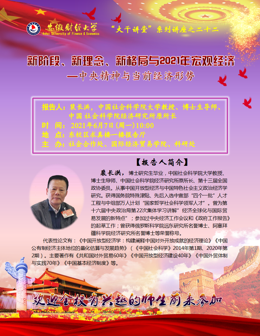 2021年6月7日:【“大千讲堂”系列讲座之二十二】新阶段、新理念、新格局与2021年宏观经济---中央精神与当前经济形势