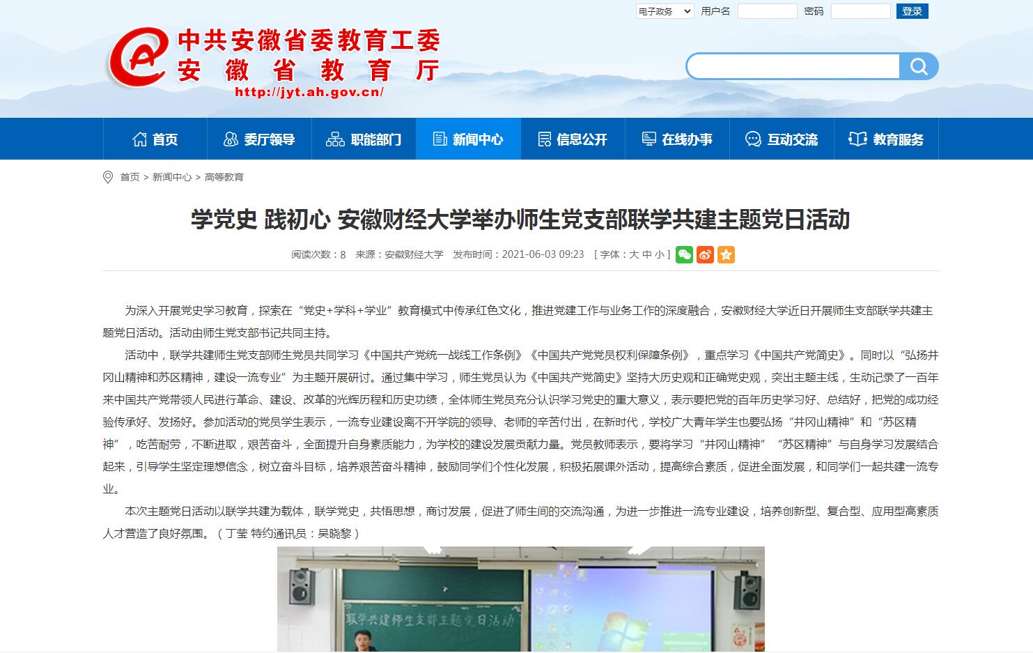 6月3日,安徽教育网以《学党史践初心乐竞在线注册举办师生党支部联学共建主题党日活动》为题报道我校举办师生党支部联学共建主题当日活动。