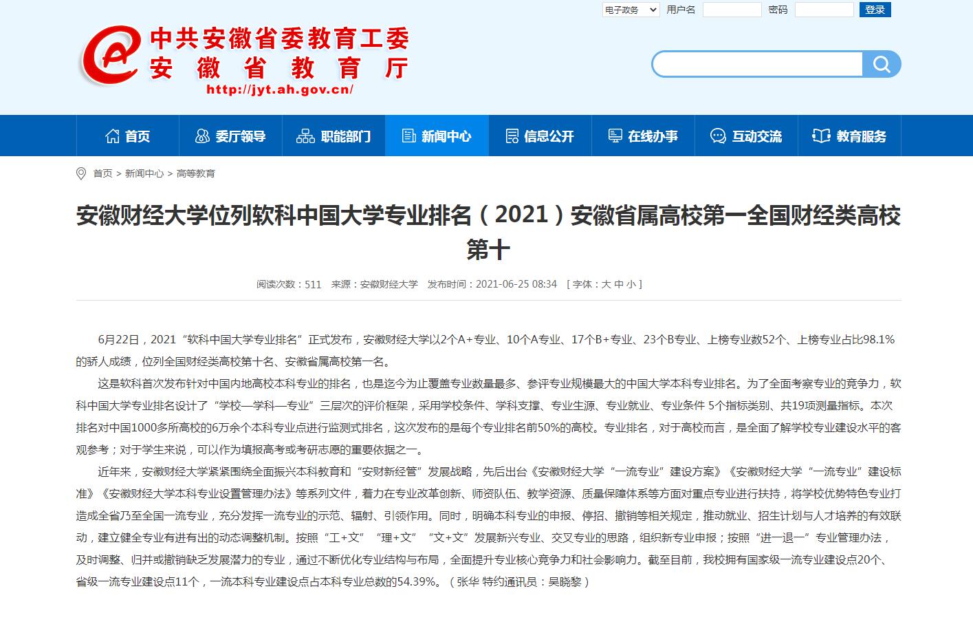 6月25日,安徽教育网以《乐竞在线注册位列软科中国大学专业排名(2021)安徽省属高校第一全国财经类高校第十》为题报道我校专业建设取得的优异成绩。