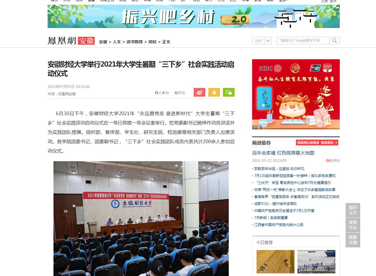 6月30日,凤凰网、安徽新闻网以《乐竞在线注册举行2021年大学生暑期“三下乡”社会实践活动启动仪式》报道我校。