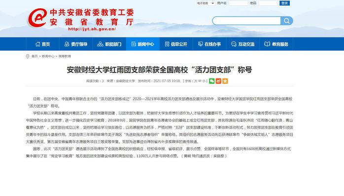 7月5日,安徽教育网报道我校国贸学院红雨团支部荣获全国高校“活力团支部”称号。