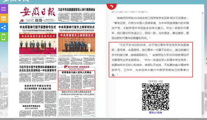 7月6日,安徽日报头版以《把青春奋斗融入党和人民事业》为题,报道我校退伍复学大学生樊丽热议习近平总书记“七一”重要讲话精神。