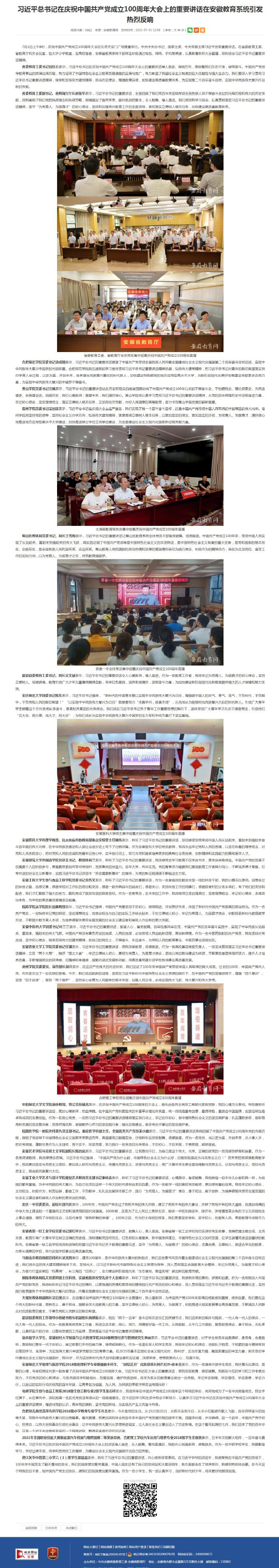7月1日,安徽教育网首页以《习近平总书记在庆祝中国共产党成立100周年大会上的重要讲话在安徽教育系统引发热烈反响》报道我校大学生樊丽热议习近平总书记“七一”重要讲话精神。