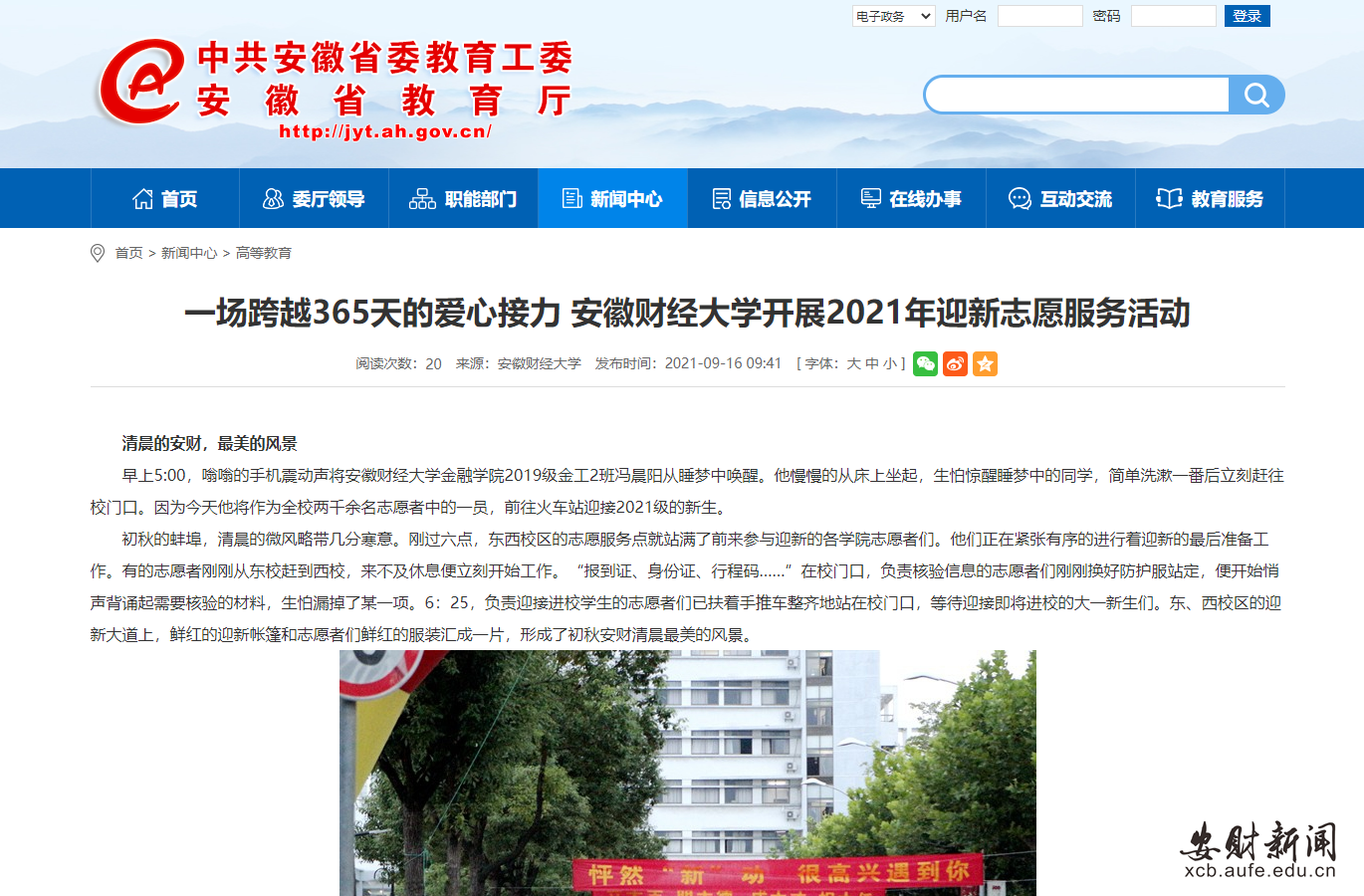 9月16日,安徽教育网以《一场跨越365天的爱心接力 乐竞在线注册开展2021年迎新志愿服务活动》为题报道我校迎新支援服务活动。