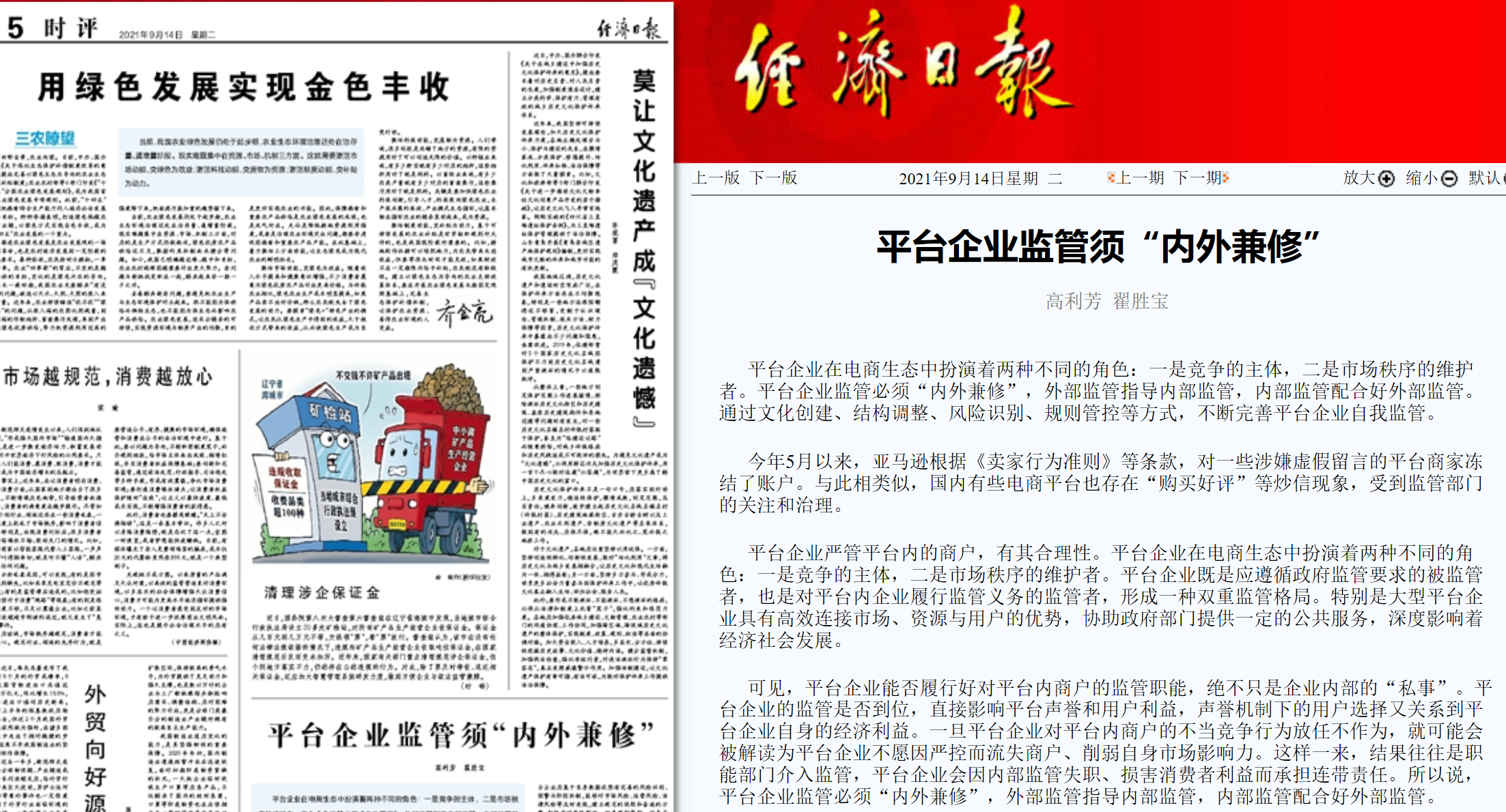 9月14日,《经济日报》第5版刊发我校高利芳和翟胜宝教授合作理论文章——《平台企业监管须“内外兼修”》,已被人民网、光明网、法制网、凤凰网、腾讯网、搜狐网、新浪网、网易网、东方网、中金在线、金台资讯等多家网络媒体转载。现将全文转载如下: