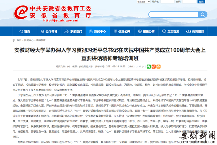9月17日,安徽教育网报道我校举办学习学习贯彻习近平总书记在庆祝中国共产党成立100周年大会上重要讲话精神专题培训班