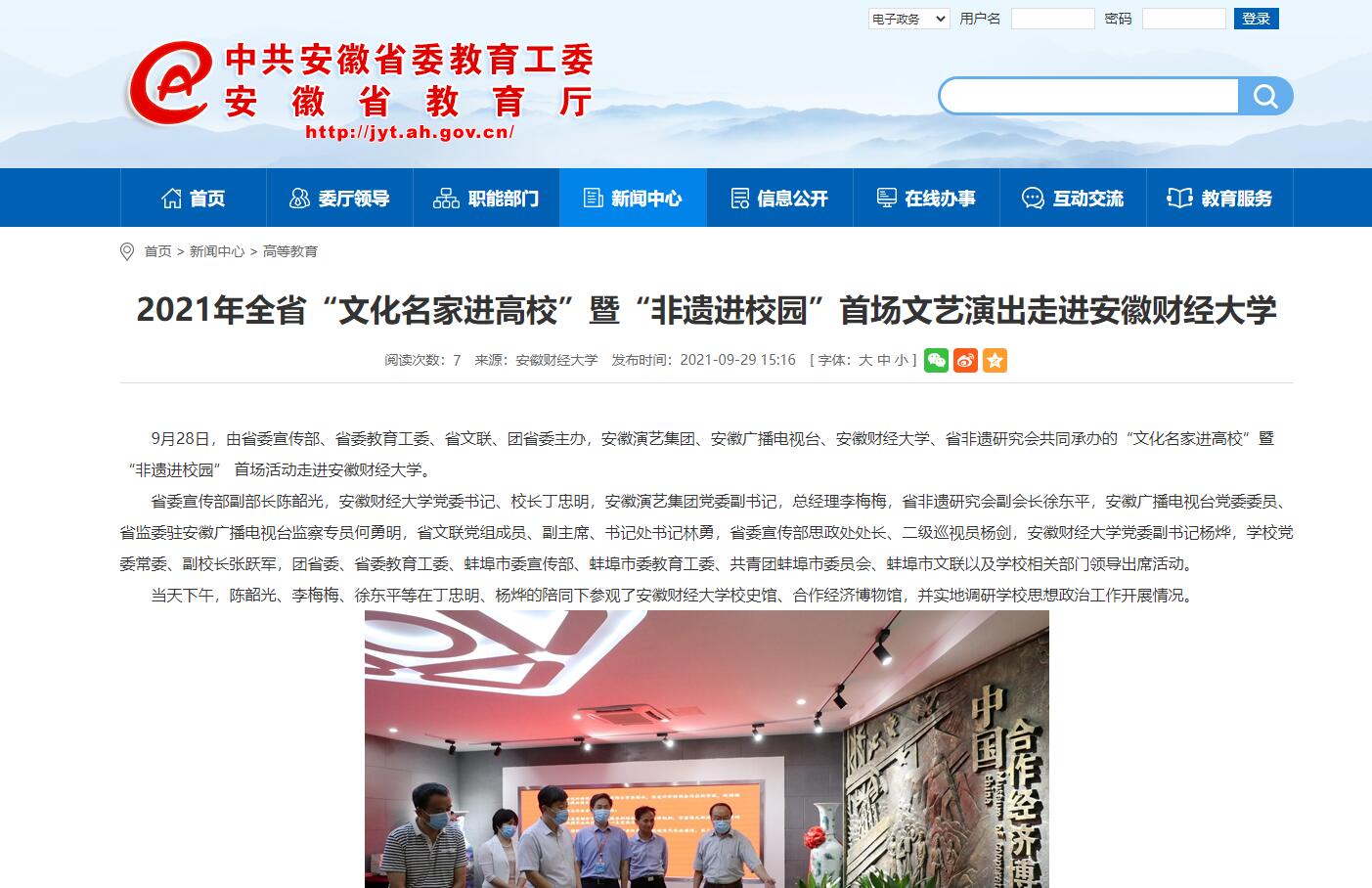 9月29日,安徽教育网以“2021年全省“文化名家进高校”暨“非遗进校园”首场文艺演出走进乐竞在线注册”为题报道我校。