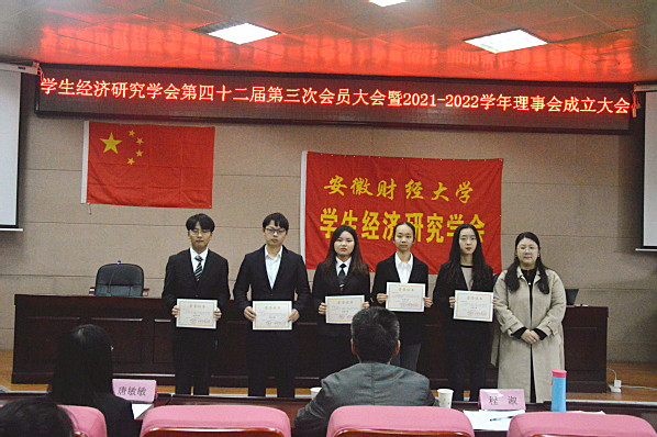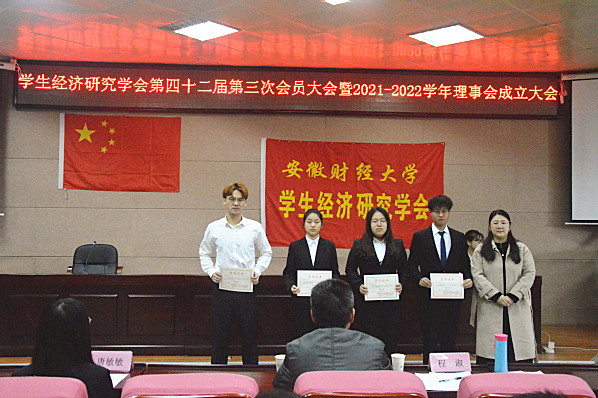 李景宝为2020-2021学年学术之星和2021-2022学年常务理事颁发聘书,程淑为2020-2021学年优秀干部和优秀干事颁发获奖证书。上任会长唐敏敏作了2020-2021学年学会工作汇报,本任会长吴昊进行了本学年工作安排,本任理事会成员依次作就职演讲。