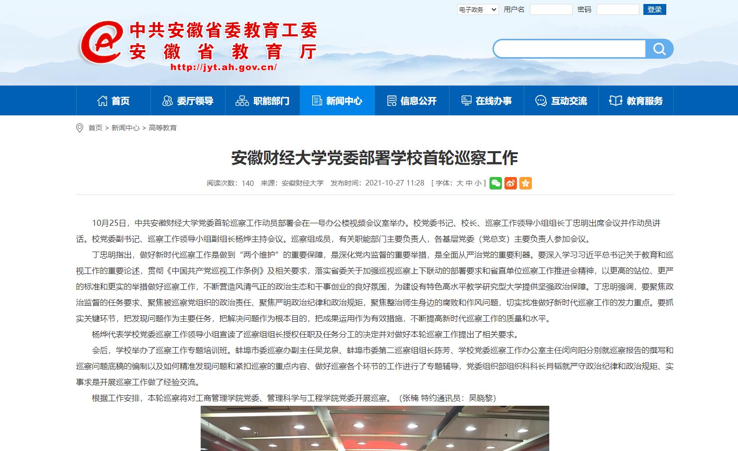 10月27日,安徽教育网报道我校党委部署首轮巡察工作。