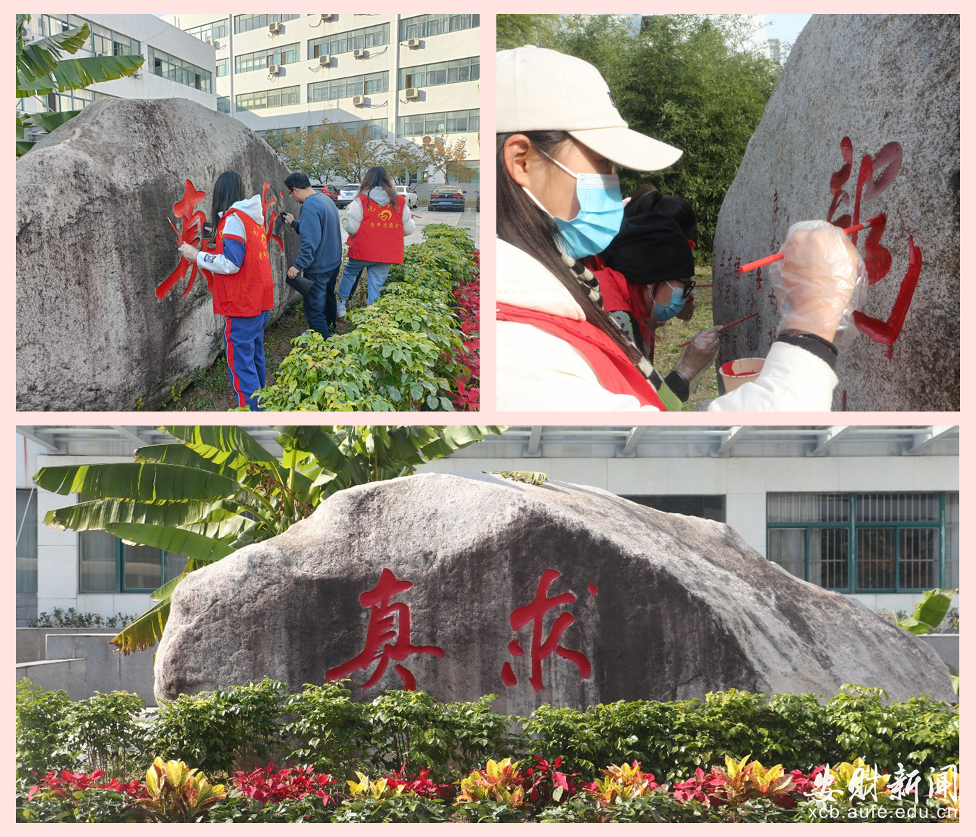 校园景观石是校园文化的重要组成部分,是学校光辉岁月的历史见证者,承载着安财一代又一代人的青春,是无数安财人心中最美的印记。但经过多年的日晒雨淋,校园景观石刻字褪色。经过前期实地考察,校园内共有11处景观石有褪色现象,经过认真挑选,安排了学生党员志愿者对校园景观石进行旧色上新。整个活动准备充分,安全工作到位,学生热情度高,达到了预期的效果。