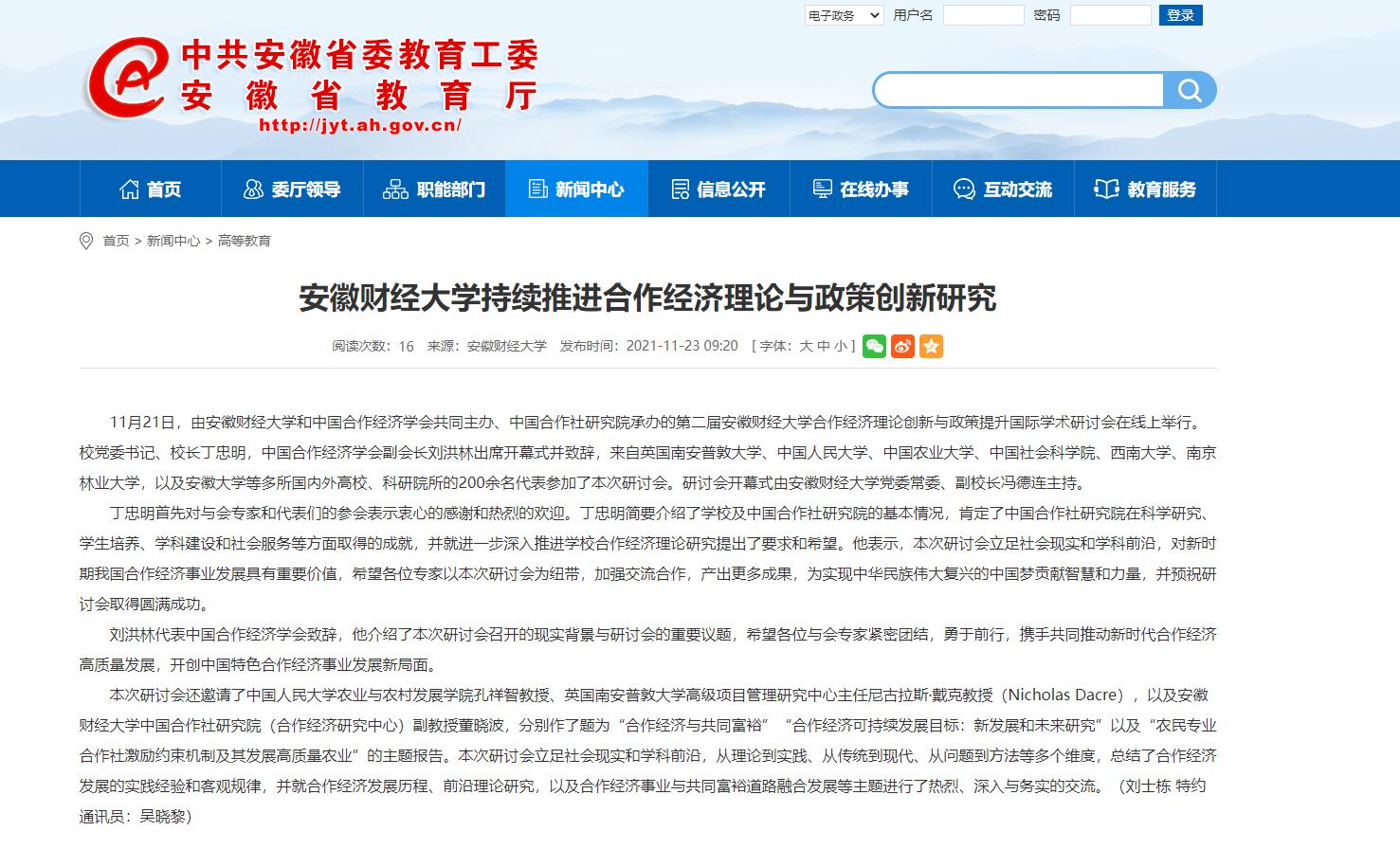 11月23日,安徽教育网报道第二届乐竞在线注册合作经济理论创新与政策提升国际学术研讨会在线上举行。
