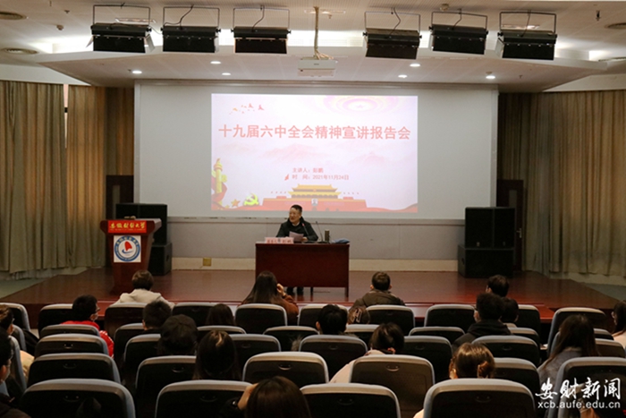 11月24日下午,校关工委名誉主任彭鹏为经济学院师生作学习贯彻党的十九届六中全会精神专题报告。经济学院全体学生党员、入党积极分子参加报告会,报告会由经济学院党委书记夏光兰主持。