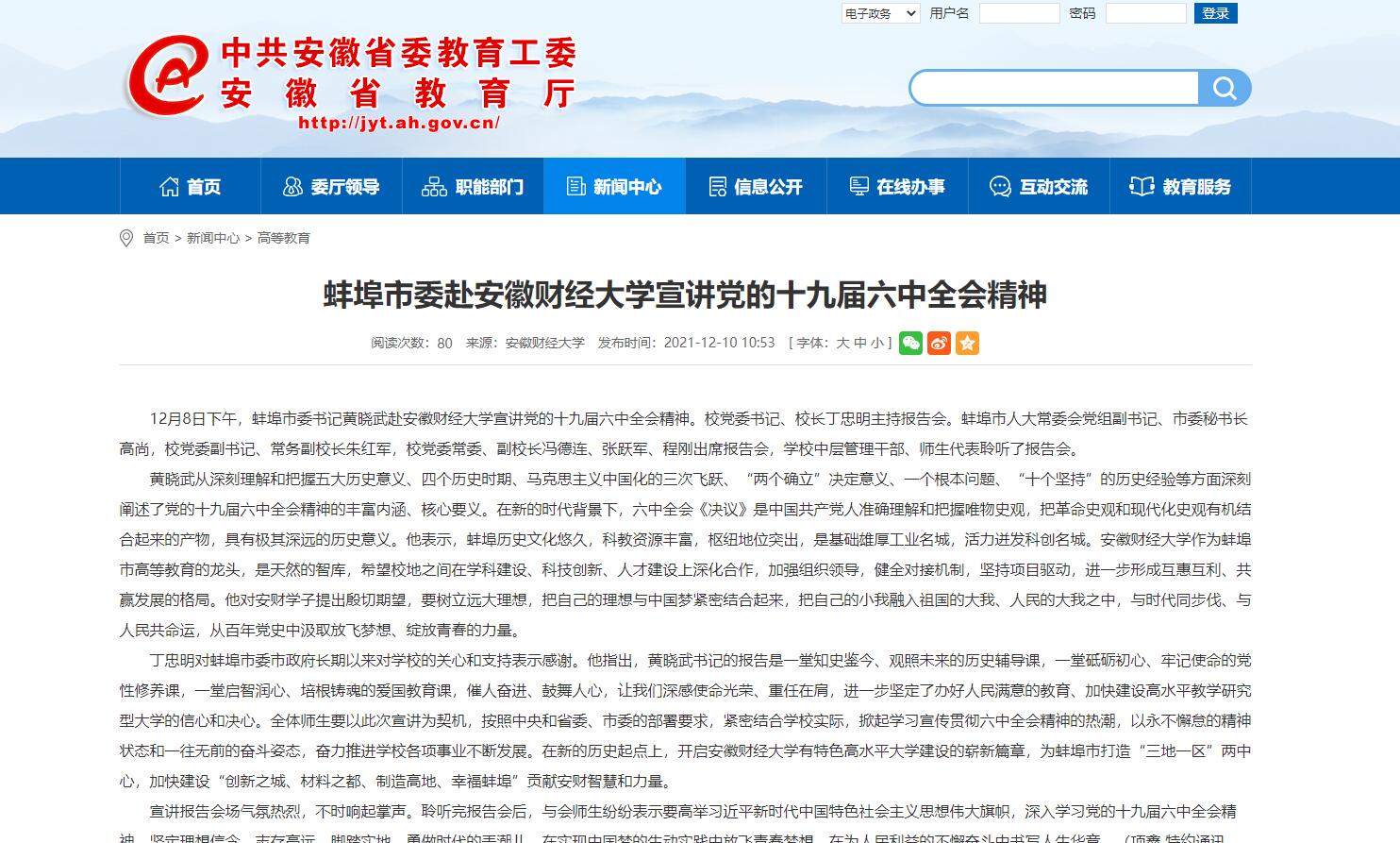 12月10日,安徽教育网报道蚌埠市委书记黄晓武赴乐竞在线注册宣讲党的十九届六中全会精神。