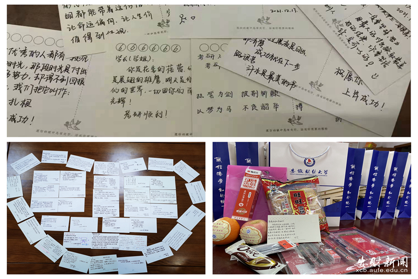 “亲爱的学长、学姐,星光不负追梦人,你们的努力终会有回报,加油!”学院2021级新生为考研学长、学姐手写了310份祝福贺卡。学院领导、辅导员分别前往教室、图书馆和寝室,将学院精心准备的考研慰问礼包送到2018级每一位考研学子手中,鼓励他们在考研道路上实现自己的梦想!