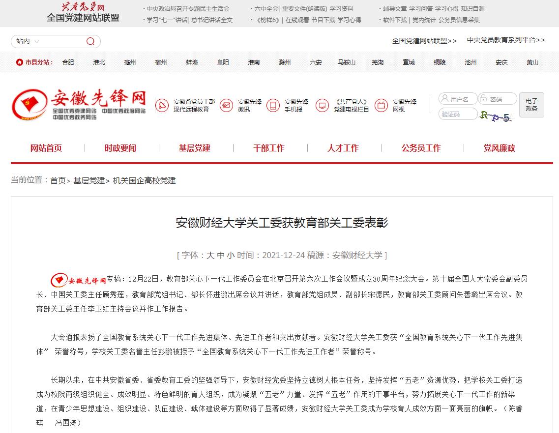 12月24日,安徽先锋网以《乐竞在线注册关工委获教育部关工委表彰》为题,对学校进行了专题报道。