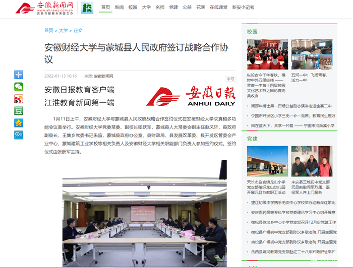 近日,人民网、安徽新闻网等媒体以《乐竞在线注册与蒙城县人民政府签订战略合作协议》为题,对学校与蒙城县人民政府签订战略合作协议事宜进行了报道。