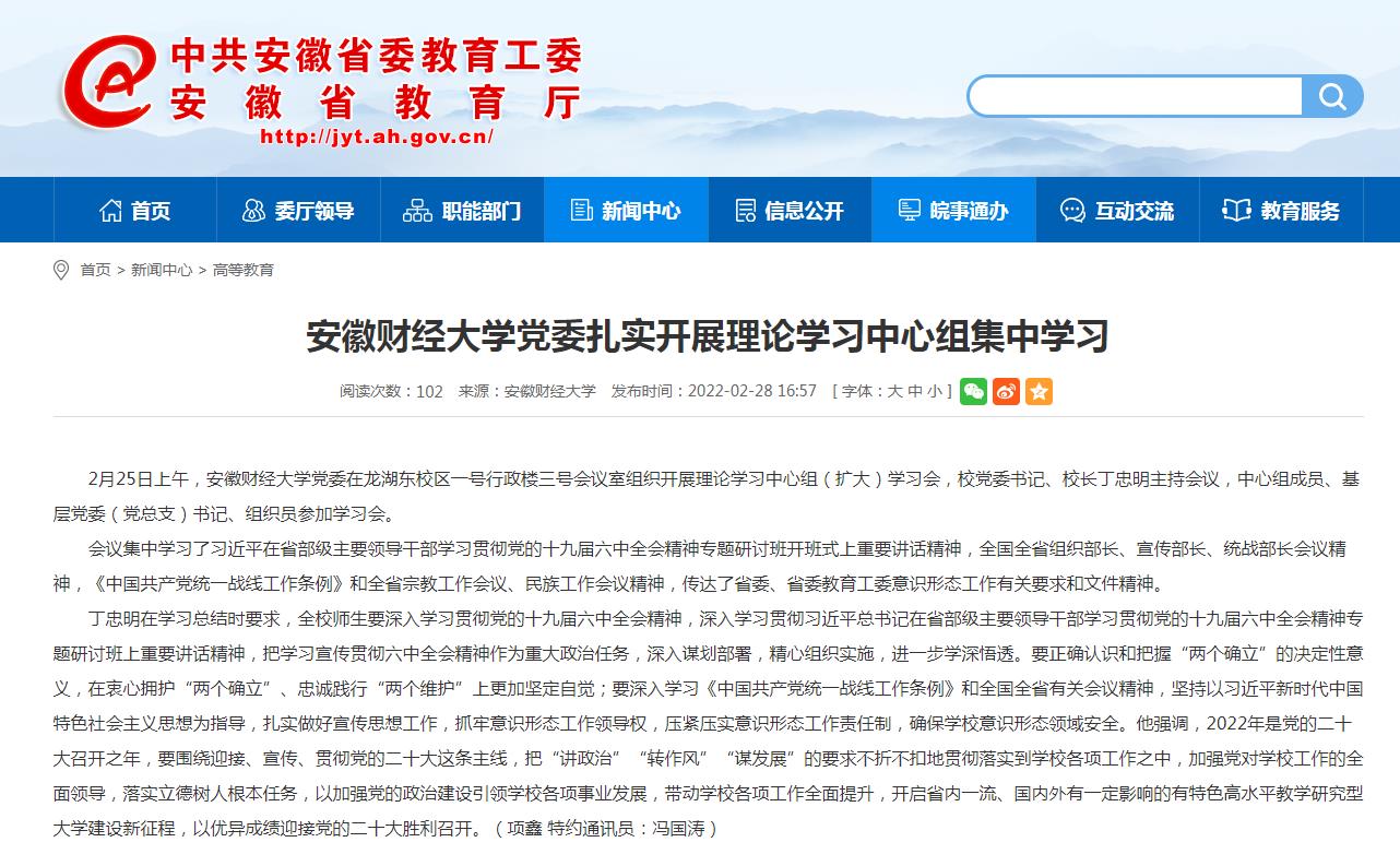 2月28日,安徽教育网以《乐竞在线注册党委扎实开展理论学习中心组集中学习》为题,报道了我校扎实开展理论中心组集中学习。