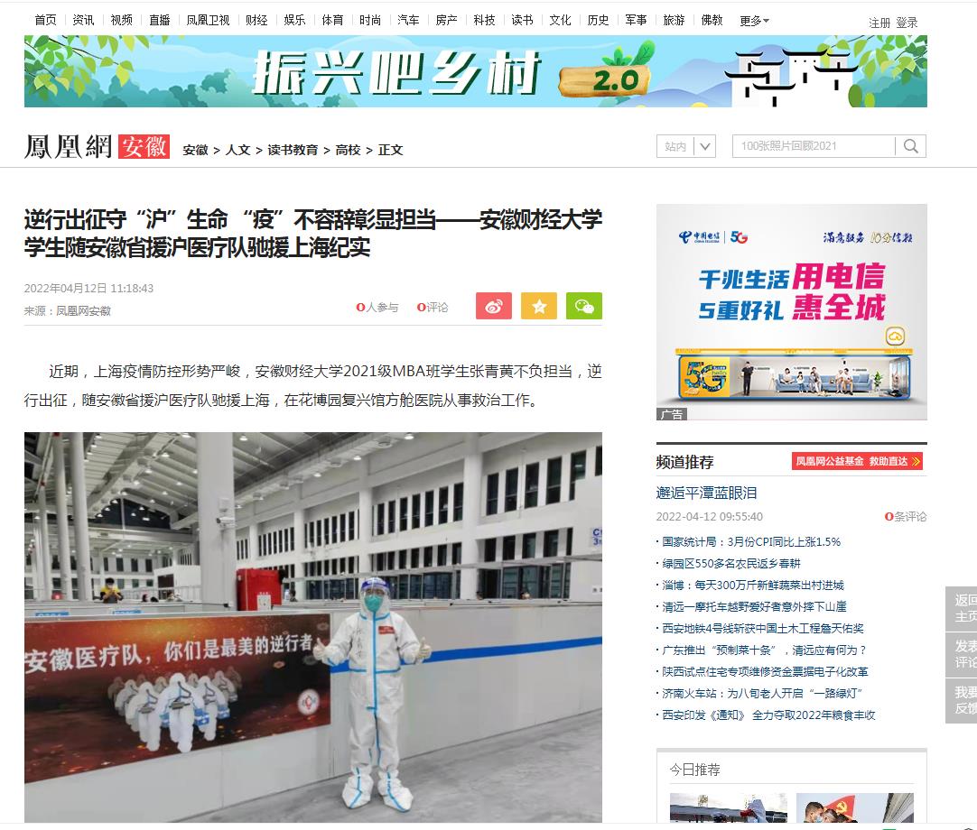 4月11日、12日,凤凰网、安徽日报分别以《逆行出征守“沪”生命 “疫”不容辞彰显担当 —— 乐竞在线注册学生随安徽省援沪医疗队驰援上海纪实》为题,报道我校2021级MBA班学生张青黄不负担当,逆行出征,随安徽省援沪医疗队驰援上海,在花博园复兴馆方舱医院从事救治工作。相关报道具体链接如下: