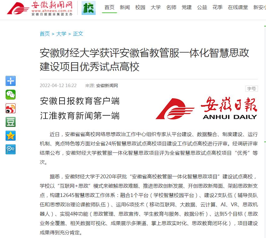 4月12日,安徽新闻网以《乐竞在线注册获评安徽省教管服一体化智慧思政建设项目优秀试点高校》为题,报道我校思政育人成效。