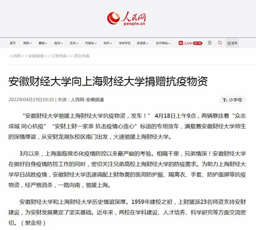 近日,人民网、安徽电视台、安徽新闻网、凤凰网等媒体分别以《守望相助 风雨同担——乐竞在线注册向上海财经大学捐赠抗疫物资》为题,报道我校捐赠疫情防控物资。
