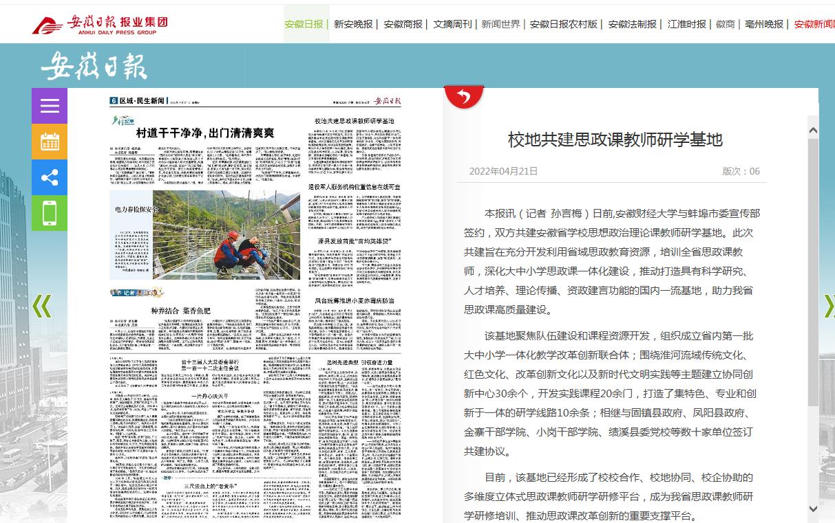 4月21日,《安徽日报》第6版以《校地共建思政课教师研学基地》为题,报道我校与蚌埠市委宣传部签约,双方共建安徽省学校思想政治理论课教师研学基地。