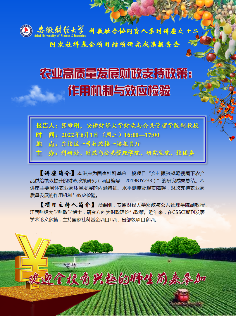 2022年6月1日:【科教融合协同育人系列讲座之十二】农业高质量发展财政支持政策:作用机制与效应检验