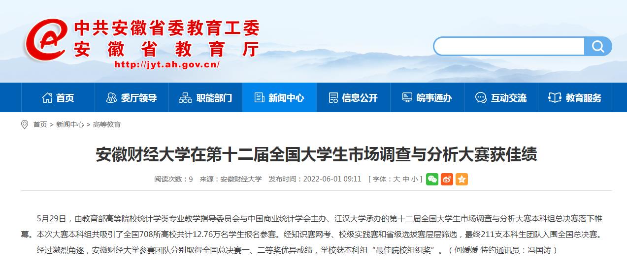 6月1日,安徽教育网以《乐竞在线注册在第十二届全国大学生市场调查与分析大赛获佳绩》为题,报道我校在第十二届全国大学生市场调查与分析大赛当中获佳绩。