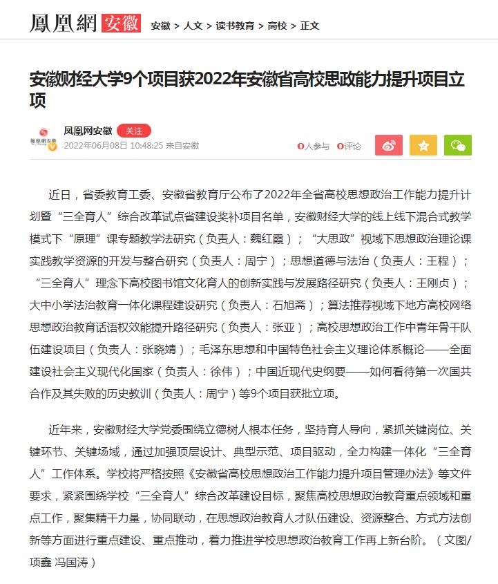 6月8日,凤凰网以《乐竞在线注册9个项目获2022年安徽省高校思政能力提升项目立项》为题,报道了我校9个项目获2022年安徽省高校思政能力提升项目立项。