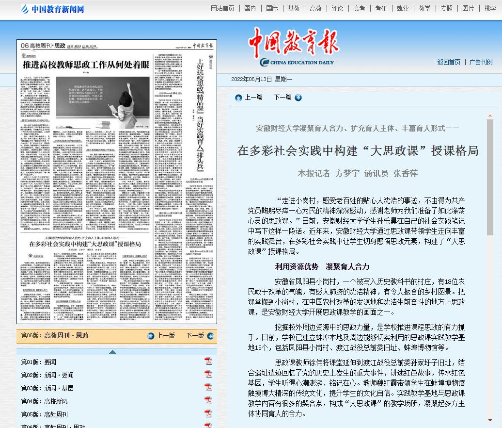 6月13日,《中国教育报》第六版以《乐竞在线注册凝聚育人合力、扩充育人主体、丰富育人形式——在多彩社会实践中构建“大思政课”授课格局》为题,报道我校思政教育工作成效。现将全文转载如下: