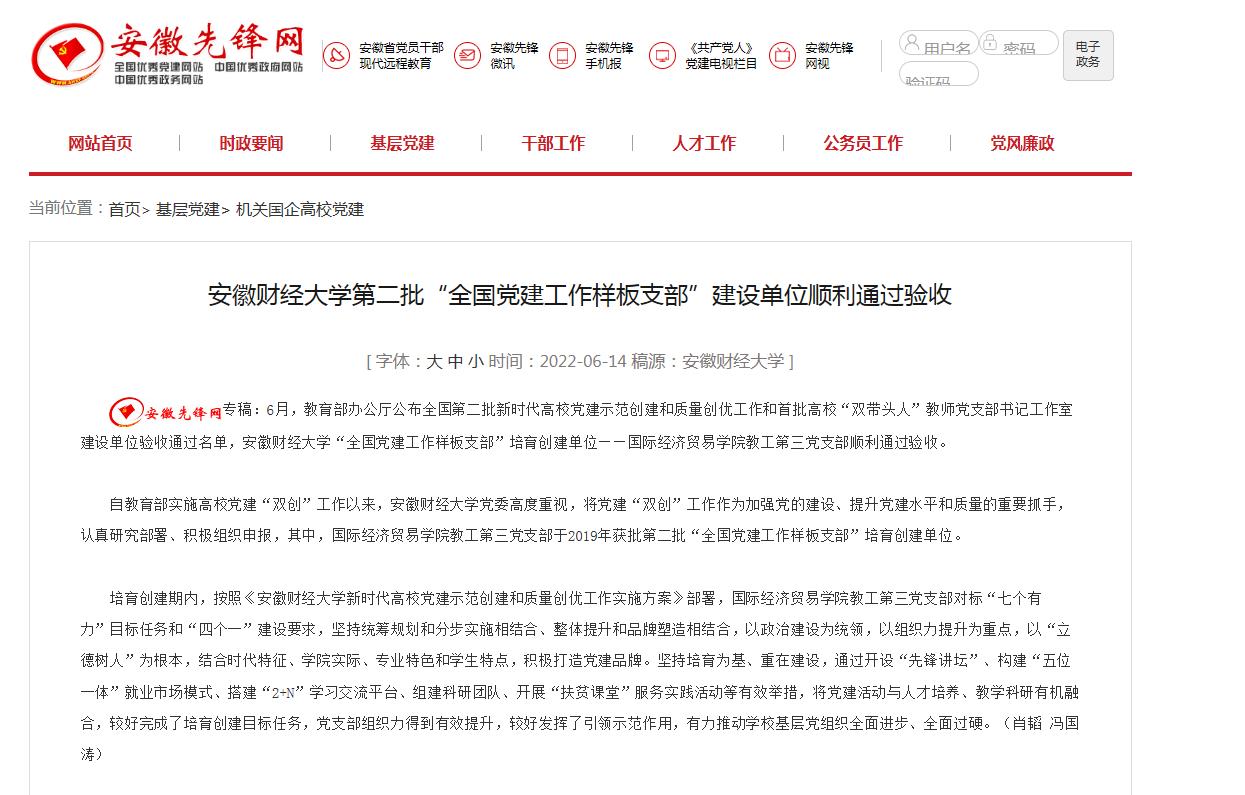6月14日,安徽先锋网以《乐竞在线注册第二批“全国党建工作样板支部”建设单位顺利通过验收》为题,报道学校党建工作成效。