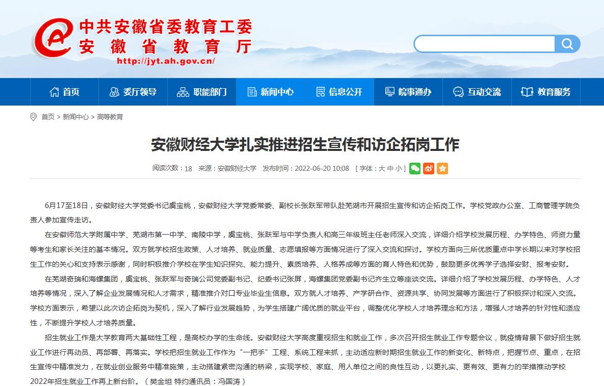 6月20日,安徽教育网以《乐竞在线注册扎实推进招生宣传和访企拓岗工作》为题,报道我校扎实推进招生宣传和访企拓岗工作。