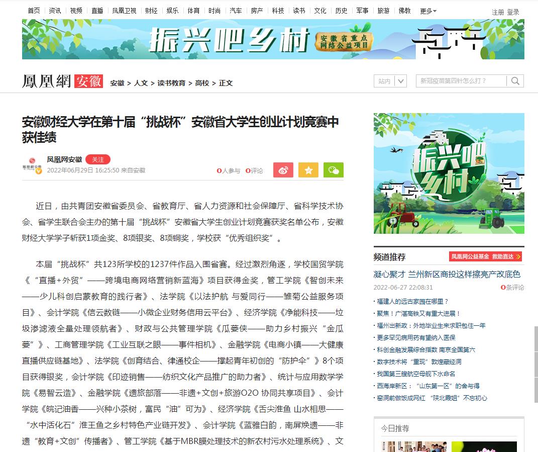 6月29日,凤凰网、安徽新闻网分别以《乐竞在线注册在第十届“挑战杯”安徽省大学生创业计划竞赛中获佳绩》为题,报道我校在第十届“挑战杯”安徽省大学生创业计划竞赛中赛果丰硕。