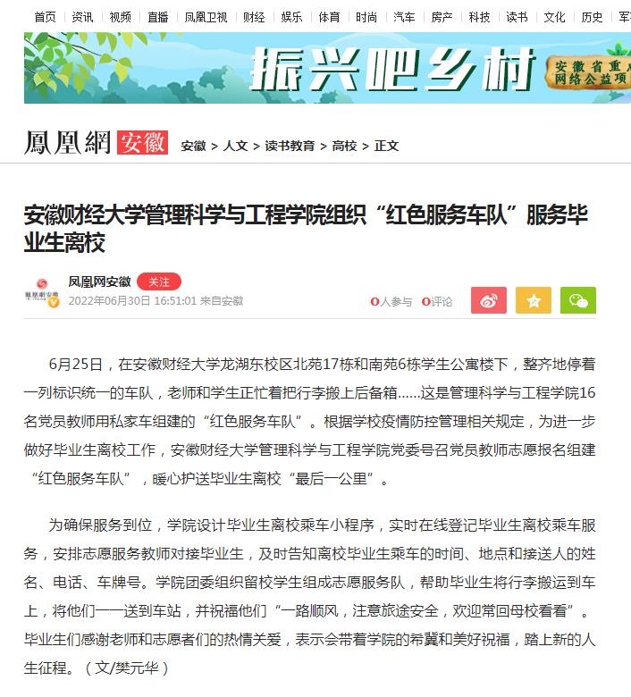 6月30日,凤凰网、安徽新闻网以《乐竞在线注册管理科学与工程学院组织“红色服务车队”服务毕业生离校》为题,报道了我校管理科学与工程学院党委号召党员教师志愿报名组建“红色服务车队”,暖心护送毕业生离校“最后一公里”。