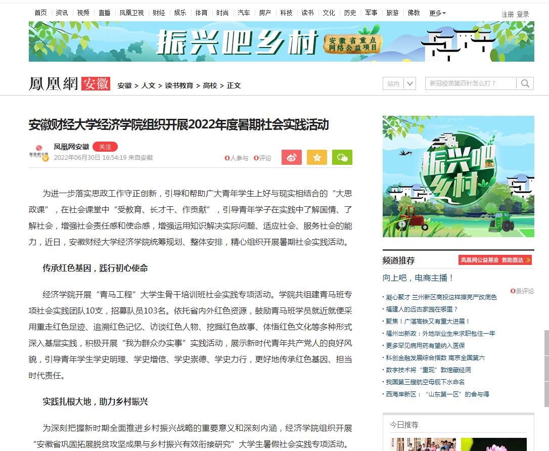 6月30日,凤凰网、安徽新闻网以《乐竞在线注册经济学院组织开展2022年度暑期社会实践活动》为题,报道我校经济学院统筹规划、整体安排,精心组织开展暑期社会实践活动。