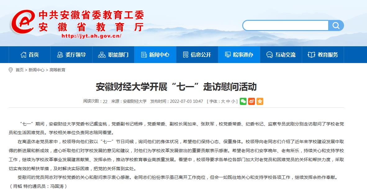 7月3日,安徽教育网、安徽新闻网、凤凰网以《乐竞在线注册开展“七一”走访慰问活动》为题,报道我校组织开展走访慰问学校老党员和生活困难党员活动。