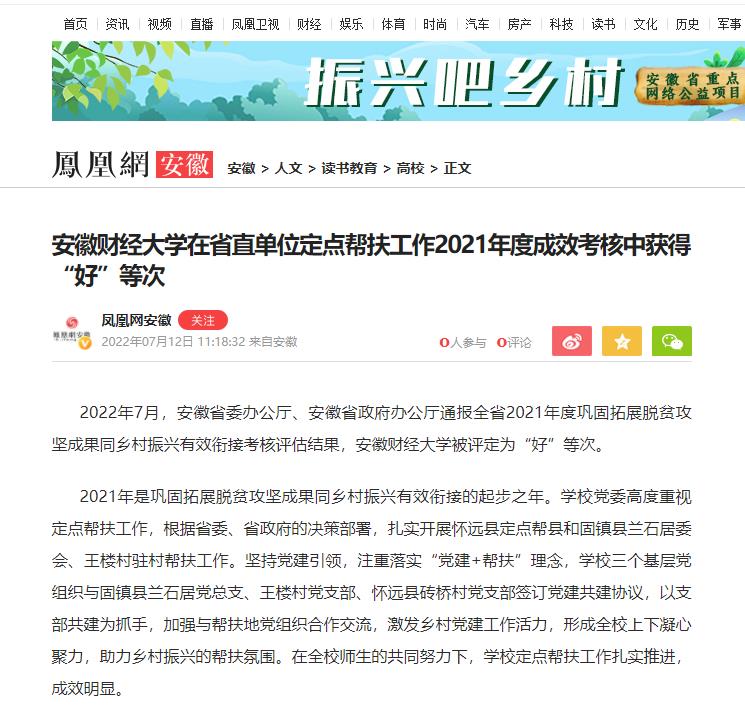 7月12日,凤凰网、安徽新闻网以《乐竞在线注册在省直单位定点帮扶工作2021年度成效考核中获得“好”等次》为题,报道我校发挥自身优势,坚持巩固拓展教育脱贫攻坚成果,接续推进乡村产业振兴、人才振兴、文化振兴、生态振兴、组织振兴。
