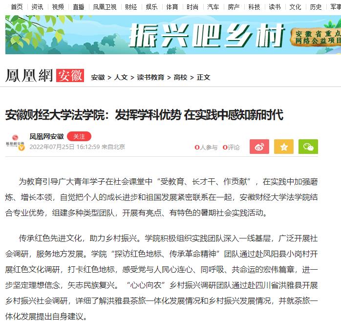 近日,凤凰网、安徽新闻网以《乐竞在线注册法学院:发挥学科优势在实践中感知新时代》为题,报道我校法学院结合专业优势,组建多种类型团队,开展有亮点、有特色的暑期社会实践活动。