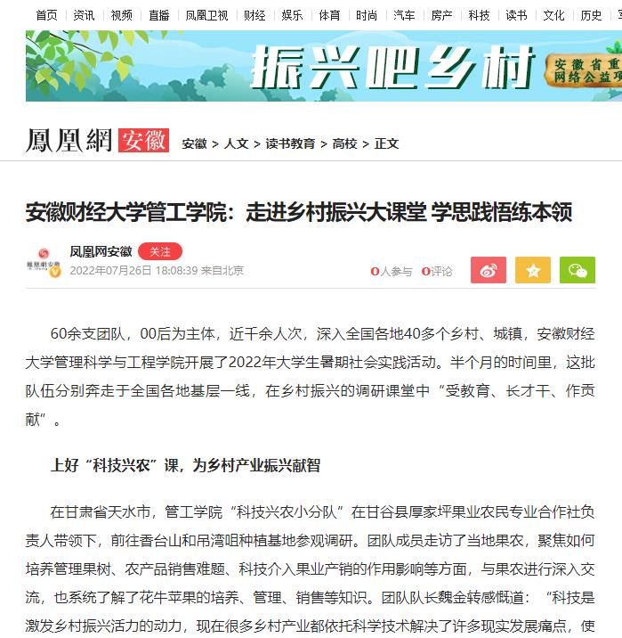 近日,凤凰网、安徽新闻网以《乐竞在线注册管工学院:走进乡村振兴大课堂学思践悟练本领》为题,报道我校管理科学与工程学院深入开展了2022年大学生暑期社会实践活动,教育引导学生在乡村振兴的调研课堂中“受教育、长才干、作贡献”。