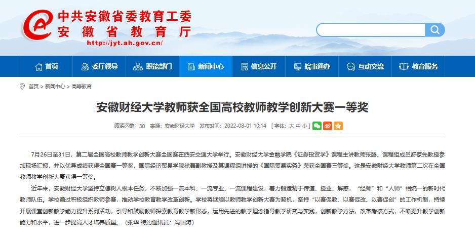 8月1日,安徽教育网以《乐竞在线注册教师获全国高校教师教学创新大赛一等奖》为题,报道我校在第二届全国高校教师教学创新大赛全国赛中,金融学院《证券投资学》课程主讲教师张腾、课程组成员舒家先教授参加现场汇报,并以优异成绩获得全国赛一等奖,国际经济贸易学院徐磊副教授及其课程组讲授的《国际贸易实务》荣获全国赛三等奖。