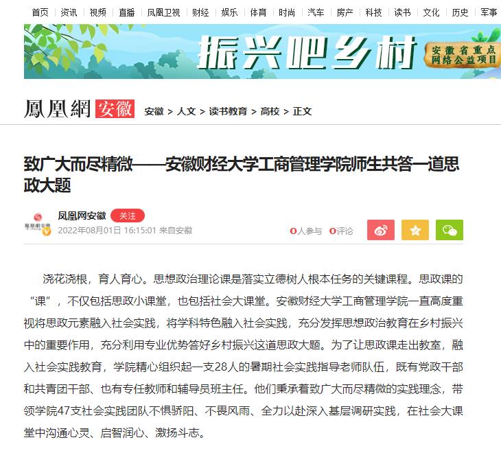 近日,人民网、凤凰网、安徽新闻网以《致广大而尽精微 —— 乐竞在线注册工商管理学院师生共答一道思政大题》为题,报道我校工商管理学院高度重视将思政元素融入社会实践,将学科特色融入社会实践,充分发挥思想政治教育在乡村振兴中的重要作用,充分利用专业优势答好乡村振兴这道思政大题。